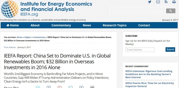 미국 에너지경제재정분석연구소(Institute for Energy Economics & Financial Analysis, IEEFA)에 따르면 2016년 중국의 해외 글로벌 신에너지 투자 규모가 $US 320억달러로 전년 대비 60% 급증했다.
