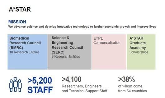 싱가포르 R&D 절반을 지원하는 연구기관으로 연구와 훌륭한 인재양성을 위해 대학과 정부 연구기관이 협력하여 다양한 프로그램을 운영, 정부 지원금 라이센스 수입 등을 계속해서 연구에 투자하고 있다.