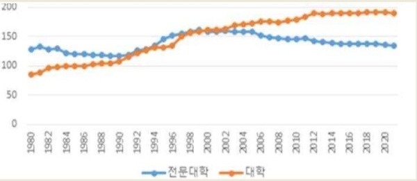 ○ 대학의 수는 ’80년 이후부터 ’00년까지 가파르게 증가해왔으나 이후에는 증가폭이 둔화되어 일정 수준을 유지하고 있는 상황