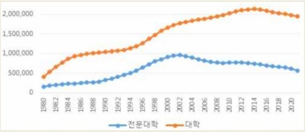 ◇ 대학의 재적학생 수도 ’00년대까지 급격히 증가하였으나, 전문대학은 ’02년 이후부터, 일반대학은 ’14년 이후부터 감소하기 시작