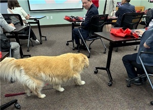 ○ 그런데 갑자기 참가자들에게 학교의 마스코트인 골든 리트리버 강아지 한 마리가 다가왔다. 홍보 담당자이자 입학처 업무를 맡고 있는 제임스 크러우포드(James Crawford)씨는 강아지를 “학생들에게 심리적 안정감을 주는 치료견(Comfort dog)이라고 소개했다.