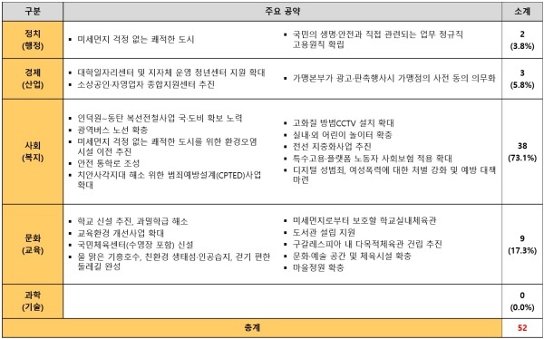 다음으로 △문화(교육) 공약 17.3% △경제(산업) 공약 5.8% △정치(행정) 공약 3.8% △과학(기술) 공약 0.0%를 각각 기록했다.