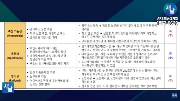셋째, 측정 가능성(Measurable) 측면에서 보면 광역버스 확충 공약의 경우 확충할 노선의 구체적인 숫자가 없어서 달성 여부 판단이 어려운 공약이었습니다.