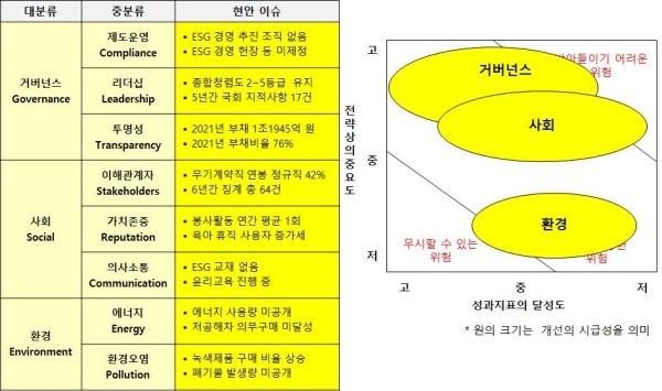 △거버넌스(Governance·지배구조)=ESG 경영 관련 헌장이나 선언문 뿐 아니라 ESG위원회·ESG자문위원회 등 ESG 경영 추진 조직이나 체계를 마련하지 않았다. 임직원 행동강령은 제정했지만 윤리강령·윤리헌장·임직원 행동강령 등은 없다. ESG 경영을 추진할 준비가 미흡하다고 볼 수 있다.