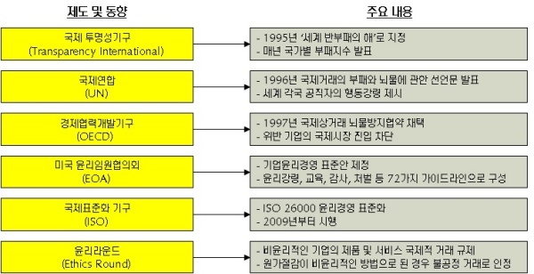 기업에 윤리경영을 강제하는 것은 국제적 흐름이다. 국제적으로 진행되는 제도 및 동향을 살펴보면 같다.