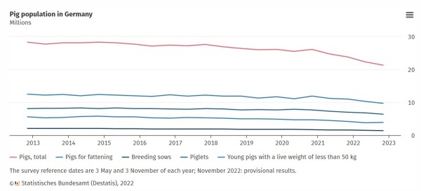 ▲2013년부터 2022년 11월까지의 독일 국내 돼지 수 그래프 [사진=독일 통계청(Destatis) 홈페이지]