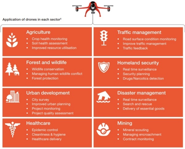 인도는 드론 최대 수입국으로 글로벌 드론 수입의 약 22.5%를 차지하고 있으며 주로 군사용 드론을 수입하고 있다. 드론시장은 군사용에서 건설, 농업, 광산, 조사, 인프라 관리, 모니터링 등 다양한 상업적 분야로 확대되고 있다.