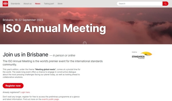 국제표준화기구(International Organization for Standardization, ISO)에 따르면 2023 ISO 연례회의(Annual Meeting)가 오스트레일리아 브리즈번(Brisbane)에서 9월18~22일까지 5일간 개최된다. 올해 에디션의 주제는 글로벌 니즈 충족(Meeting global needs)이다.