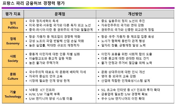 국정연(국가정보전략연구소, iNIS)이 지방자치단체의 행정·선거공약을 평가하기 위해 개발한 ‘오곡(五穀)밸리혁신(5G Valley Innovation)’ 모델을 적용해 프랑크푸르트의 금융허브 경쟁력을 정치·경제·사회·문화·기술 측면에서 평가했다.