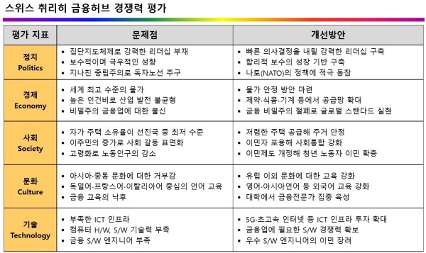 국가정보전략연구소(국정연)가 지방자치단체의 행정·선거공약을 평가하기 위해 개발한 ‘오곡(五穀)밸리혁신(5G Valley Innovation)’ 모델을 적용해 취리히의 금융허브 경쟁력을 정치·경제·사회·문화·기술 측면에서 평가했다.