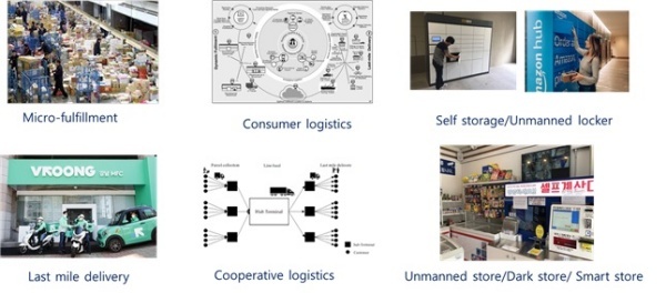 • 도시물류 기술: 도심형 공동물류센터 (micro fulfillment center), 보관 시스템(self storage, 택배 보관함 포함), 라스트 마일 배송, 무인매장 (스마트스토어, 다크 스토어) 등 효율적인 보관, 운송, 유통을 위한 기술