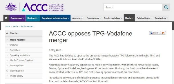 오스트레일리아 소비자감시기구인 경쟁소비자위원회(ACCC)에 따르면 통신기업인 TPG와 동종기업인 보다폰오스트레일리아(Vodafone Australia)의 기업 합병 제안을 거부했다.