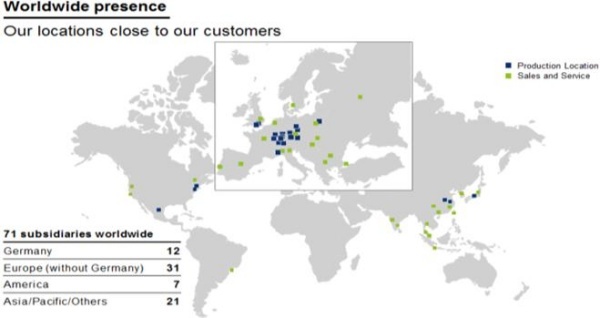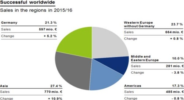 지역별 매출액을 보면, 아시아가 27.4%(7억7000만 유로)로 가장 많고, 서유럽 23.7%(6억6400만 유로), 독일 21.3%(5억9700만 유로) 순으로 나타났다.