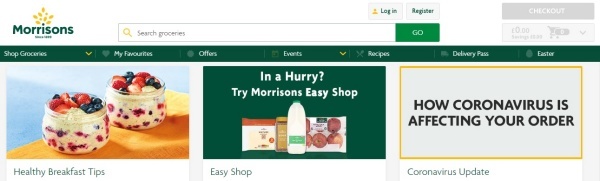 영국 수퍼마켓체인 운영기업인 모리슨(Morrisons)에 따르면 코로나-19 위기사태 동안 £35파운드짜리 생활필수품 패키지 제품을 예약 및 택배 판매한다. 5파운드의 택배비가 포함됐다.