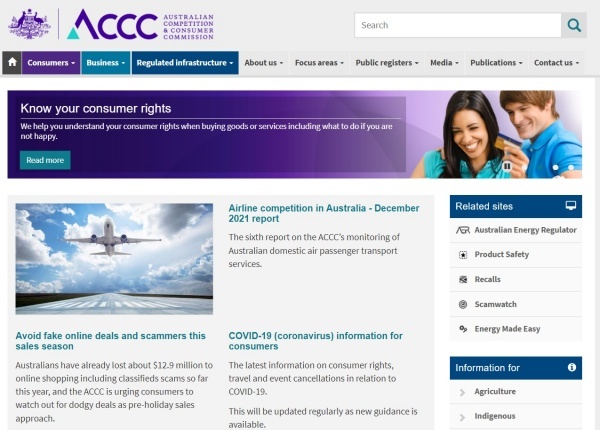▲ 경쟁소비자위원회(Australian Competition and Consumer Commission, ACCC) 홈페이지